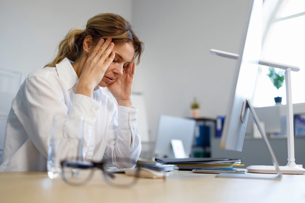 Headaches are another big warning sign. These often start behind the eyes or at the temples and become more intense as the day goes on. Staff might reach for painkillers mid-afternoon or dim their monitor in an attempt to cope. Some people also experience neck and shoulder tension because they lean forward or tilt their head to avoid reflections on their screen or to read tiny, contrast-poor text.